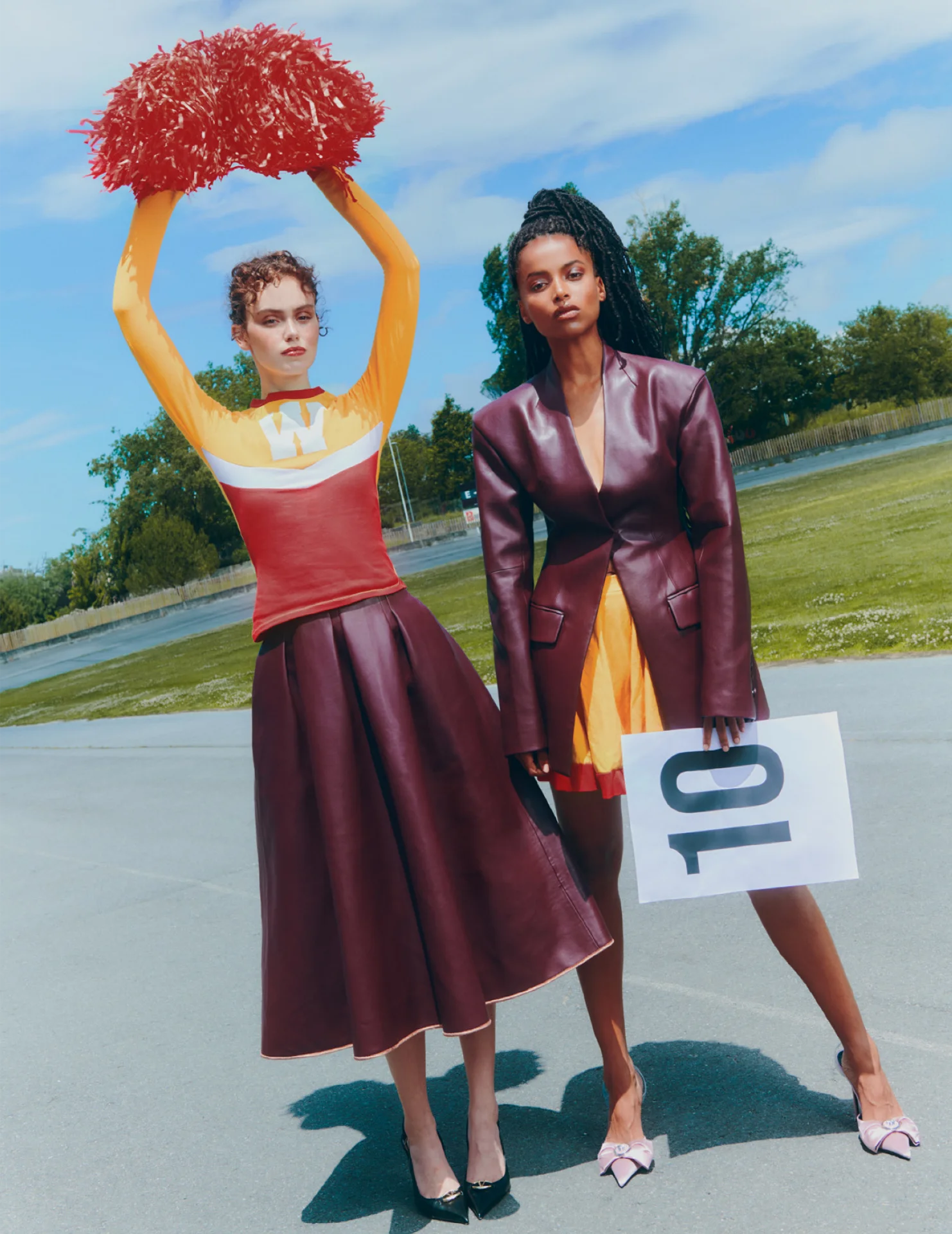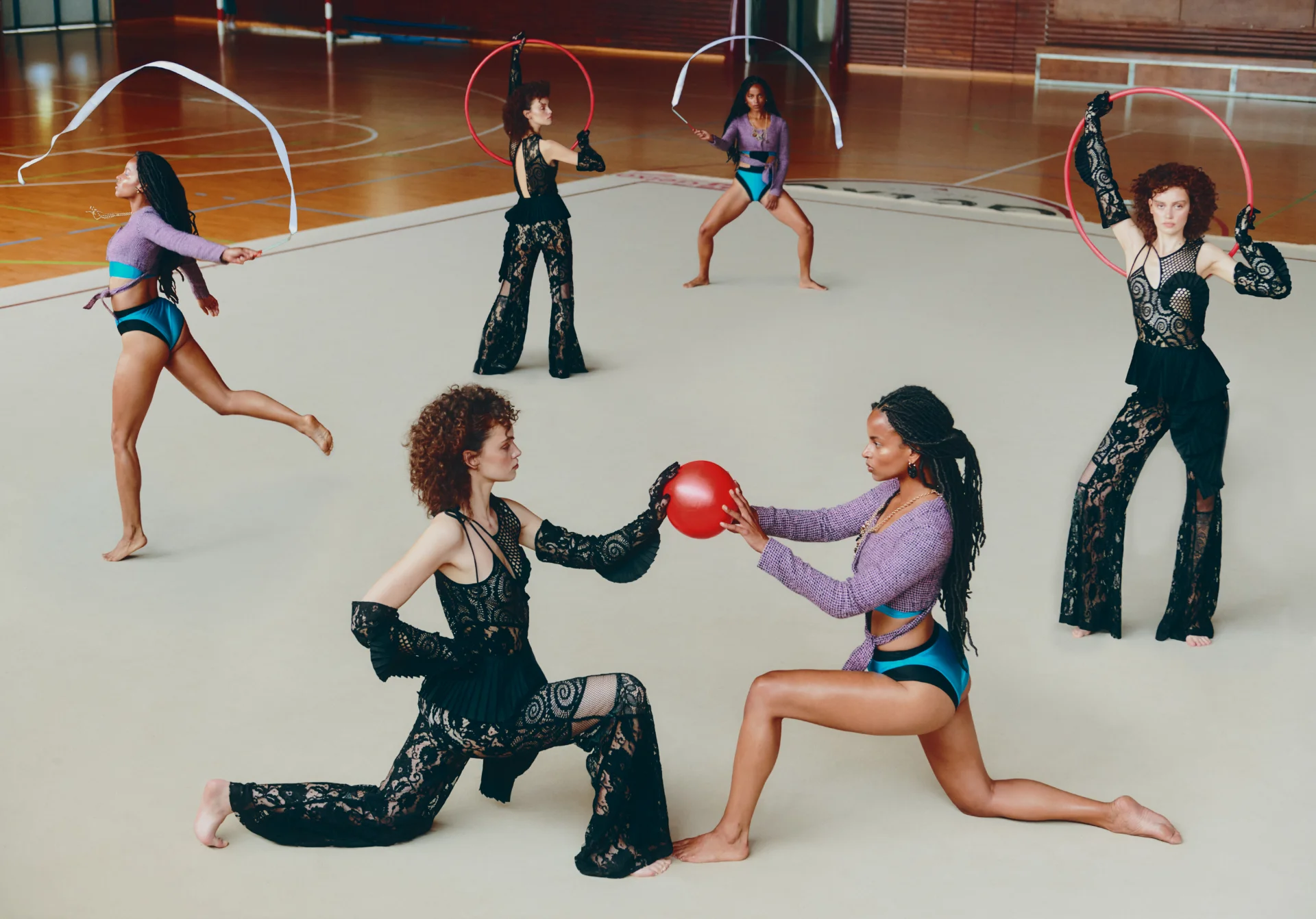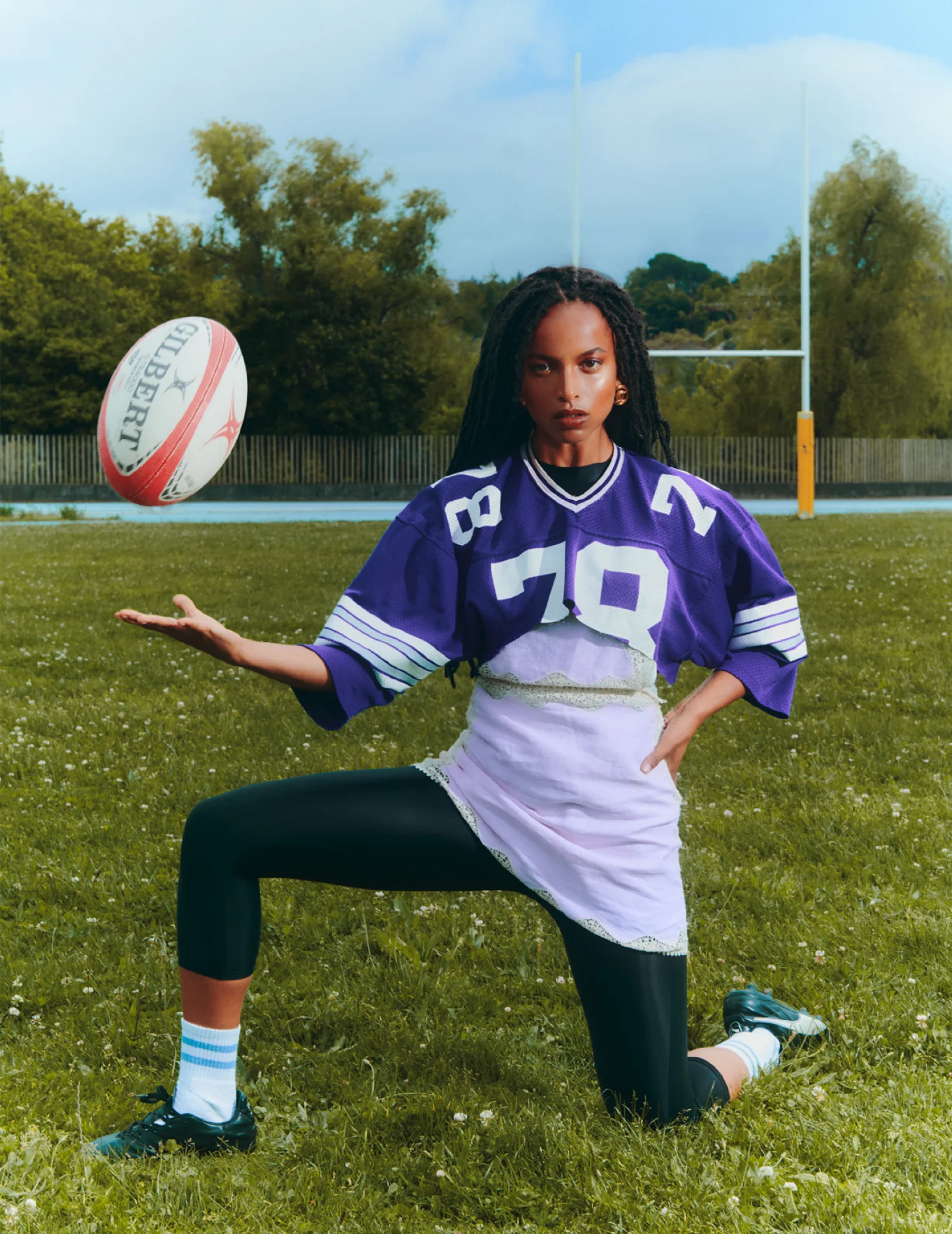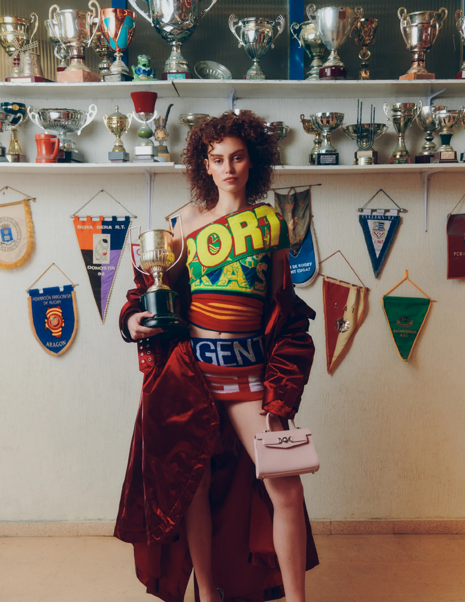 Think crochet bodysuits, tulle layered over leggings, flowing skirts paired with sportswear tights. Think striking poses, boxing gloves turned into accessories, bold coats at the goalpost — because even goalkeepers can get cold. Above all, this is about turning it into the plural: the winners take it all.