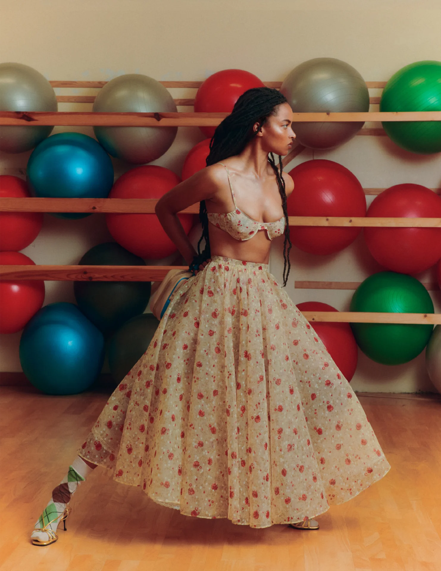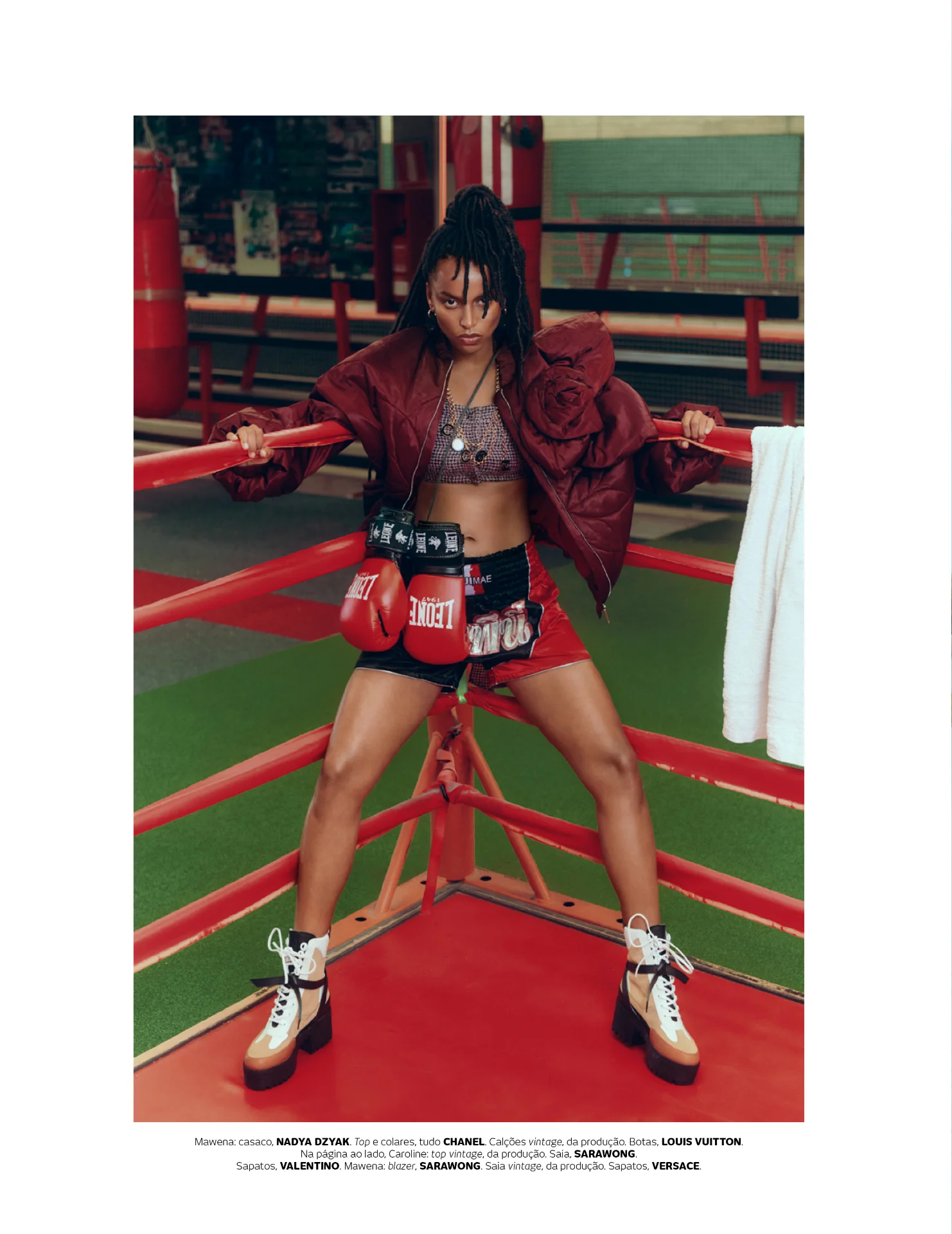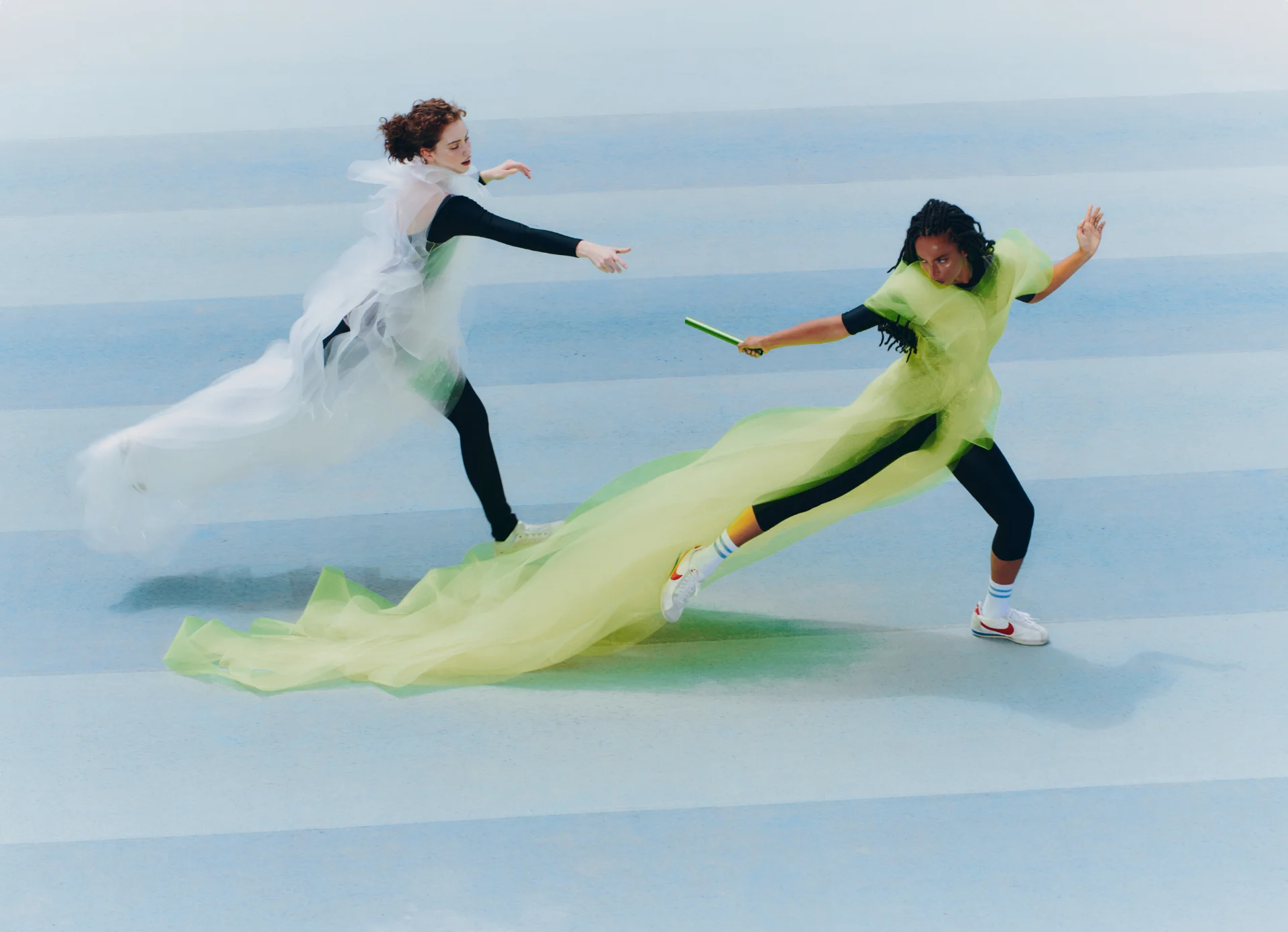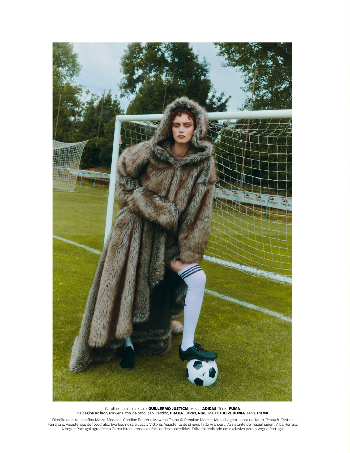 Think crochet bodysuits, tulle layered over leggings, flowing skirts paired with sportswear tights. Think striking poses, boxing gloves turned into accessories, bold coats at the goalpost — because even goalkeepers can get cold. Above all, this is about turning it into the plural: the winners take it all.